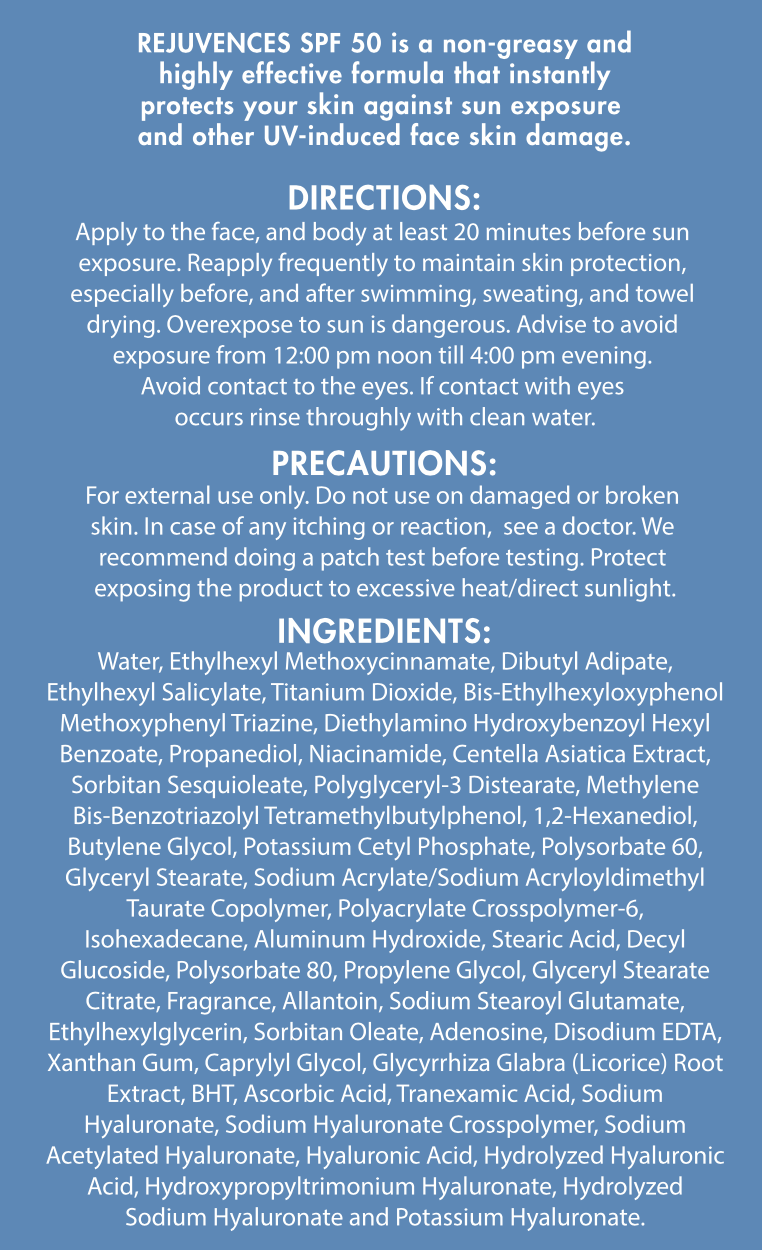 Say hello to your new favorite sunscreen! Rejuvences Sunscreen SPF 50 is a lightweight, water-based, non-greasy formula designed to protect and nourish your skin. Perfect for daily use, it leaves no white cast and provides superior sun protection while delivering skincare benefits.