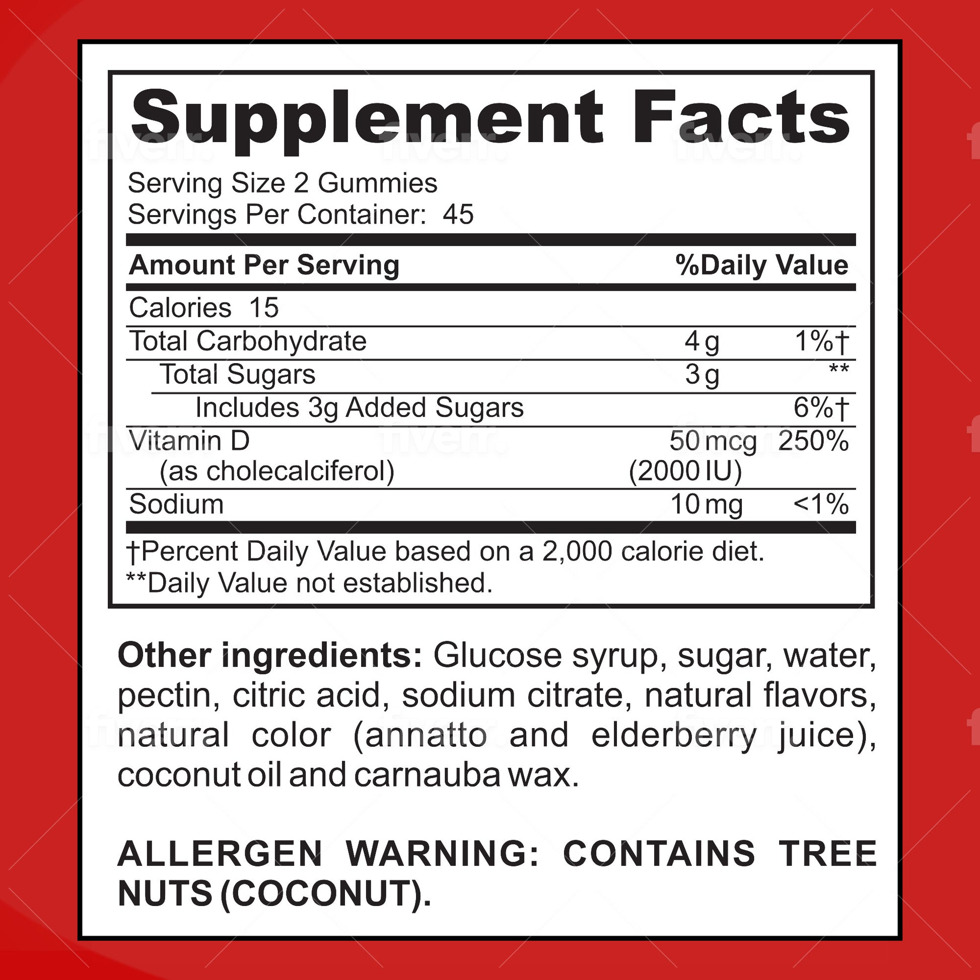 250% RECOMMENDED DAILY VALUE OF VIT D - Each gummy consists of 250% of the recommended daily value (based on a 2,000 calorie per day diet) of vitamin D. Our premium-quality vit D gummies are vegetarian friendly.